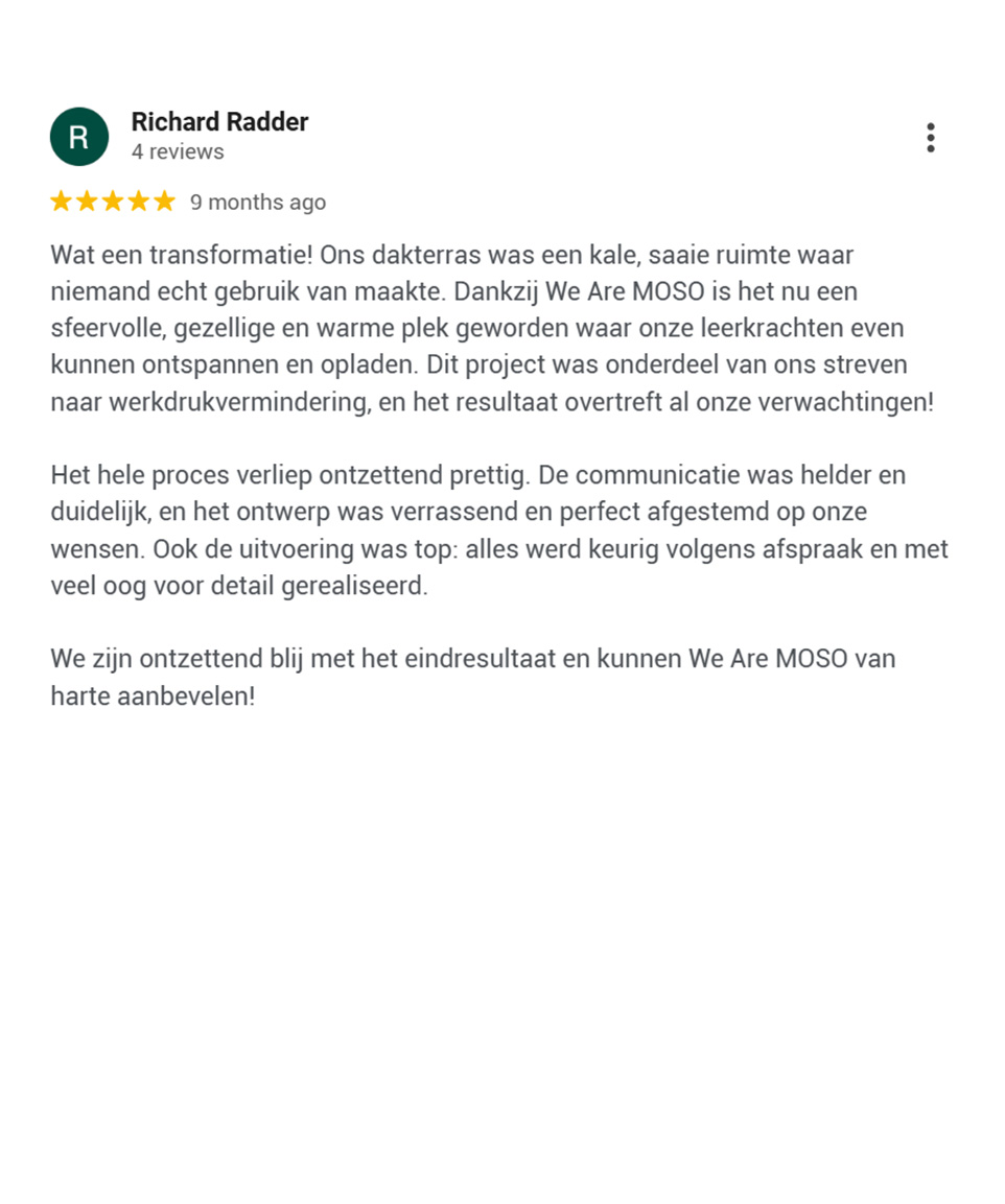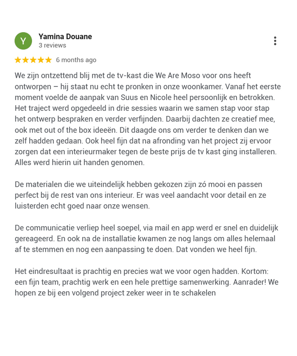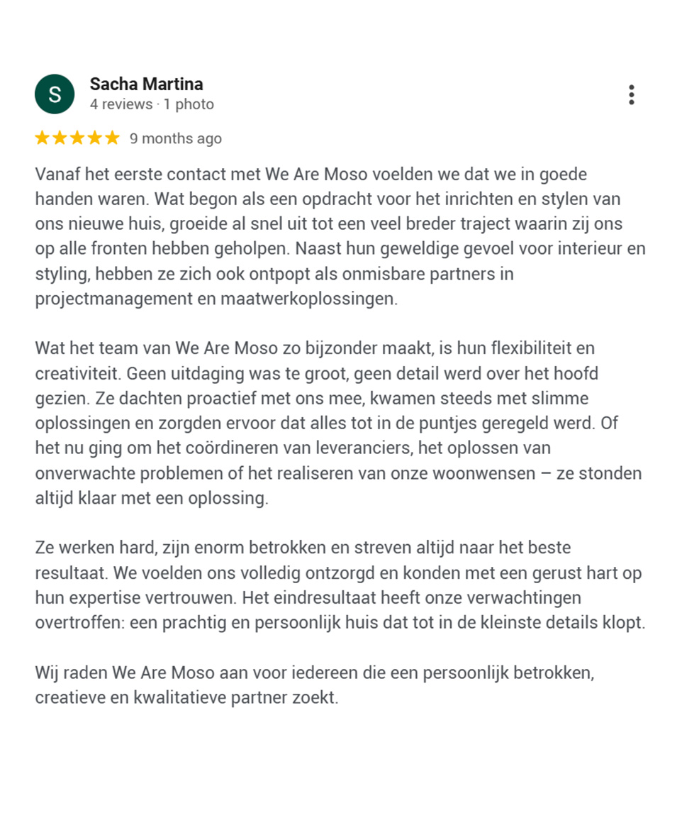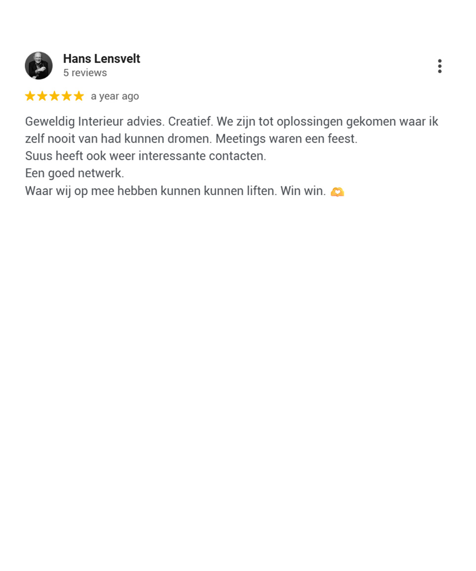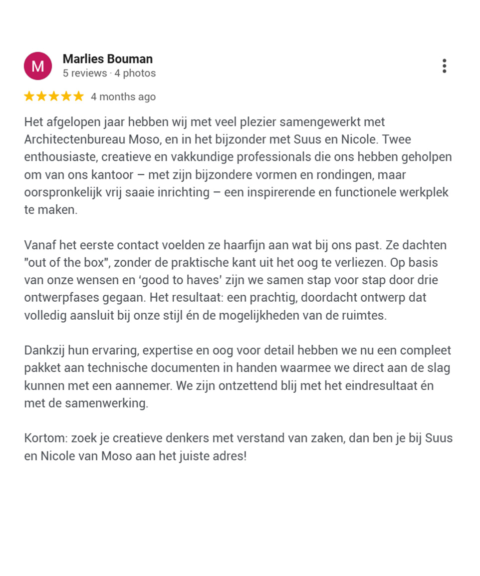 Wij werken niet vóór onze opdrachtgevers, maar werken samen mét hen. We luisteren aandachtig, lezen tussen de lijntjes en vertalen hun wensen naar ontwerpen die verder gaan dan ze zelf voor mogelijk hielden. Wij durven hen omver te blazen met creatieve, doordachte en gedurfde concepten. Wij geven niet alleen waar ze om vragen, we geven ze wat ze écht nodig hebben. Ontdek wat anderen over ons zeggen en check de reviews: